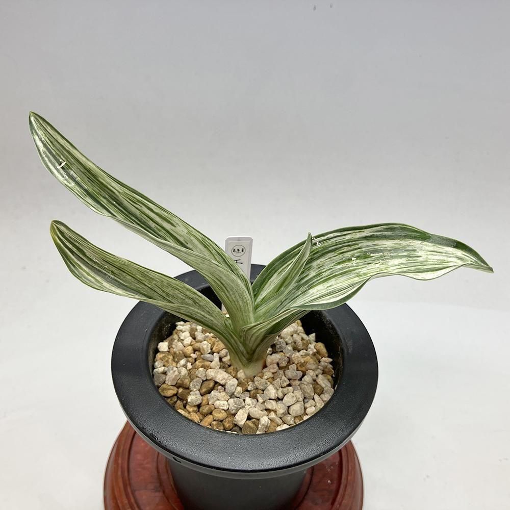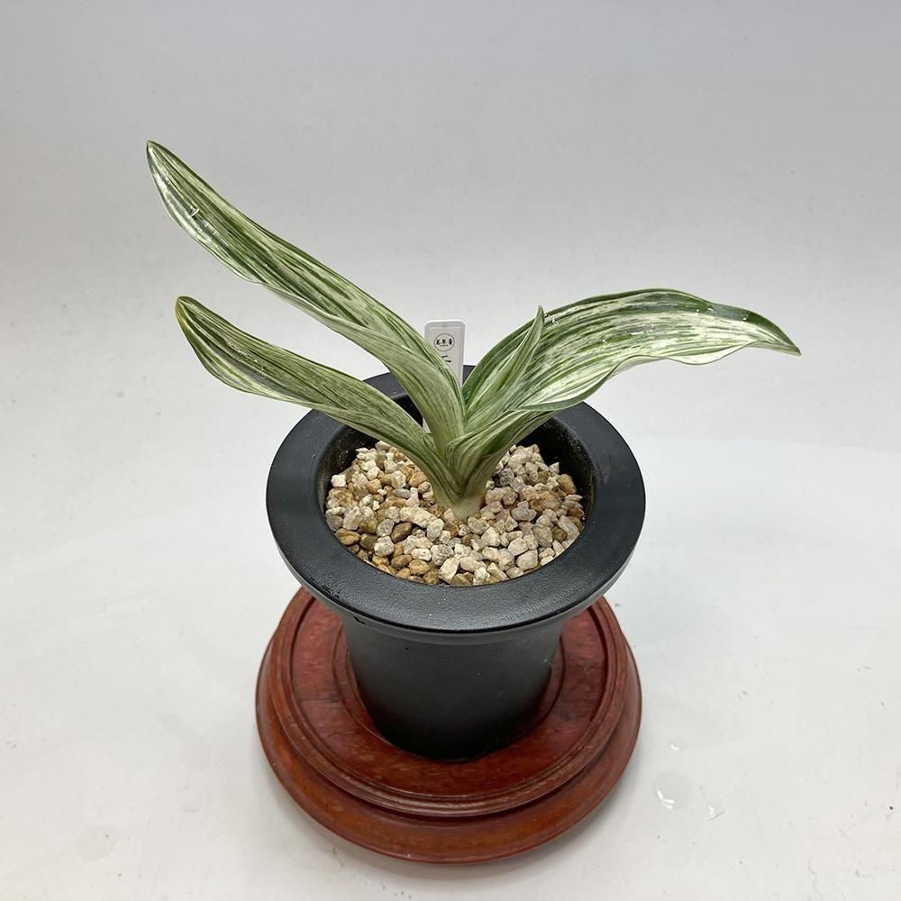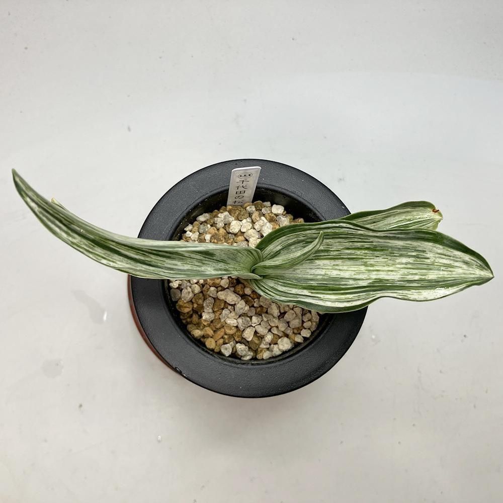 葉長15cm、葉幅5cm内外。葉先は丸止めで、たるみのない引き締まった葉は見るからに厚く、折り下げが少なく、腰の低い太い首元には安定感がある。千代田斑は白く冴え濃紺緑色の深覆輪と調和して、全体では力強く男性的な葉姿に仕上がる。名前が示すように千代田系の代表的品種で、今日でも王者として君臨している。