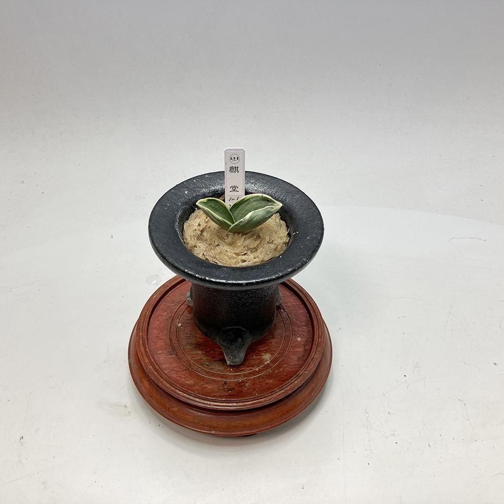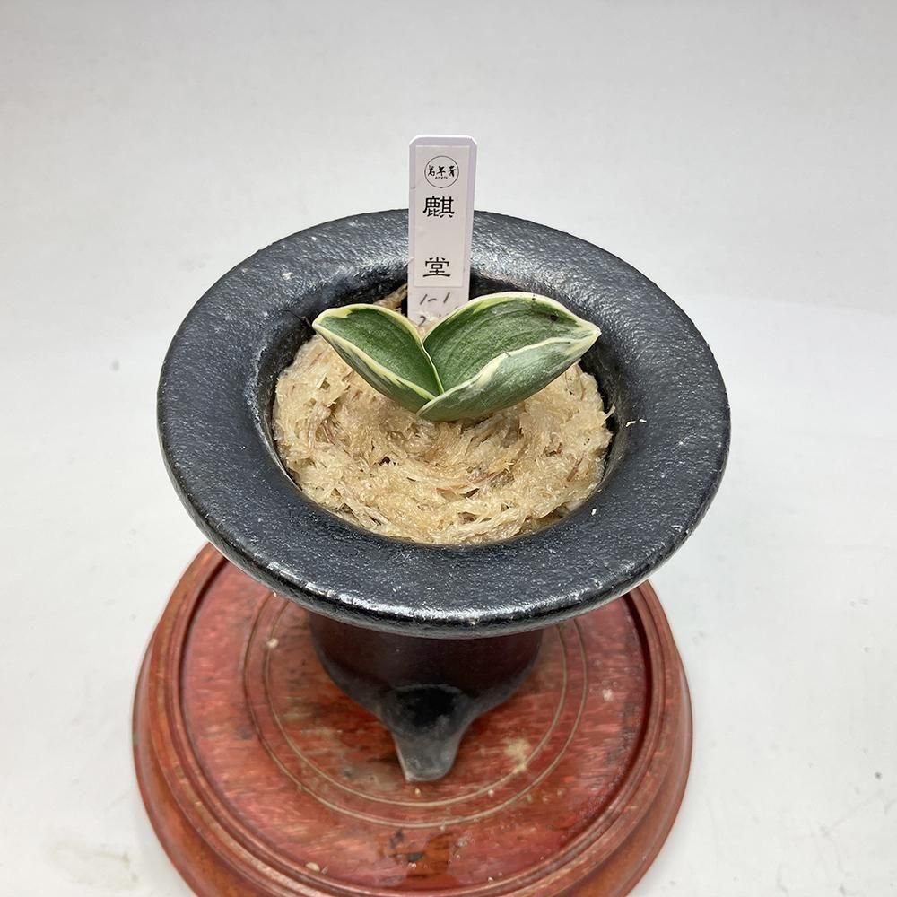葉長6cm、葉幅3cm内外で、葉肉が厚く、整然とした彫りの深い総雅糸竜を現し、葉姿は程よく折り下げ量感を感じさせる。黄色みの強い深い覆輪が本種の特徴でもあり、魅力でもある。