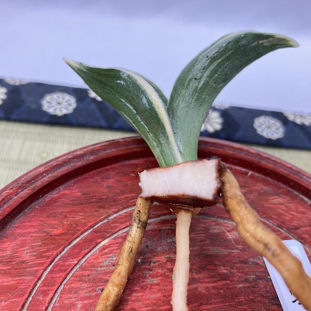 葉肉が厚く、葉先はやや丸い。葉幅も広く首太で重厚感にあふれている。雪白の深い覆輪を現し、雅糸竜と熨斗葉が主体であるが、時に鈴虫剣などを現す。三才頃から剣葉を現し始め、盛り上がる雅糸竜を現す。